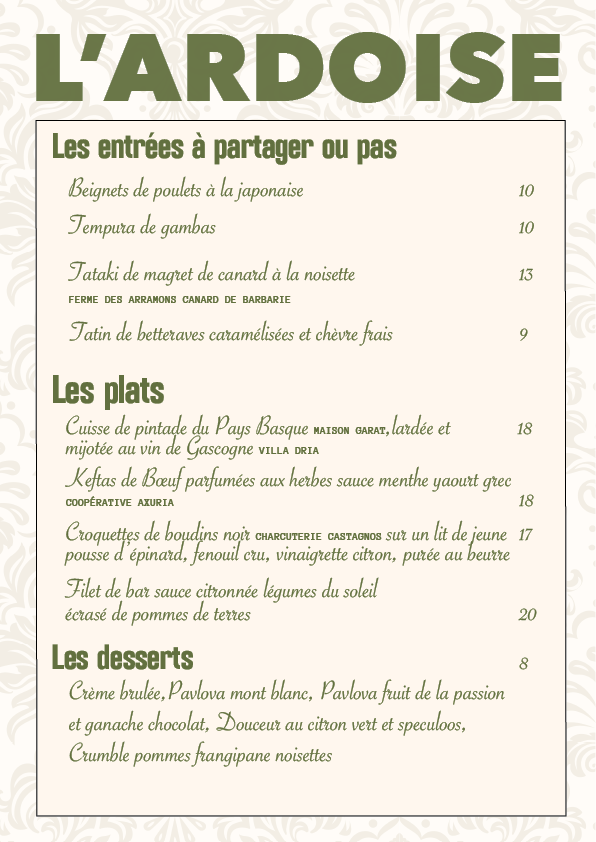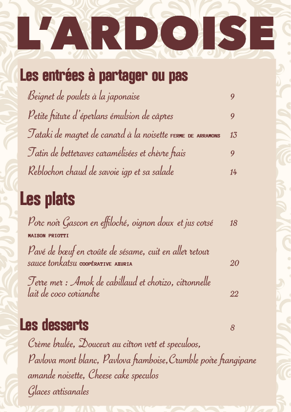 LA CARTE Le Bistro Sotiate vous propose une carte qui change au rythme des saisons. Pensez à réserver… Vous pouvez aussi commander vos gâteaux pour des évennements menu donné à titre indicatif sous réserve de modifications du chef… LA CARTE NOS VINS NOS VINS